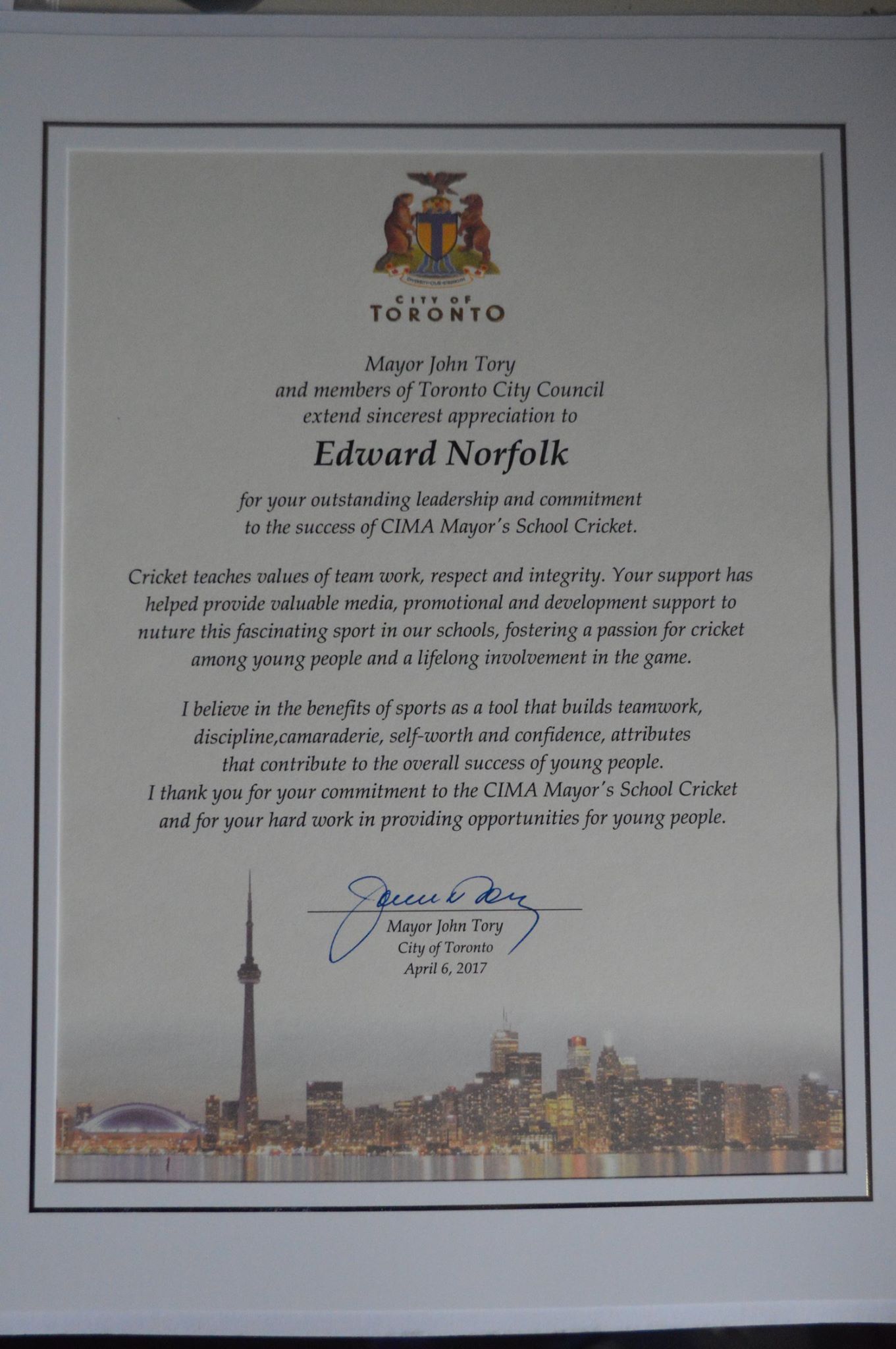 “This tournament has given young Torontonians the opportunities to engage in a sport that has become hugely popular in Toronto,” said Mayor Tory. “I am delighted to see so many of Toronto’s young cricketers receiving awards today.”