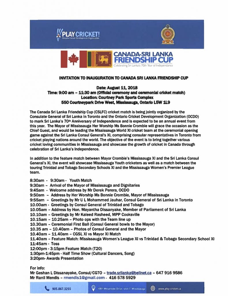 Canada-Sri Lanka Friendship Cup News Next post Previous post By Canada Cricket Online / August 11th, 2018 / Comments Today, August 11. Details in the image (Visited 1 times, 1 visits today)