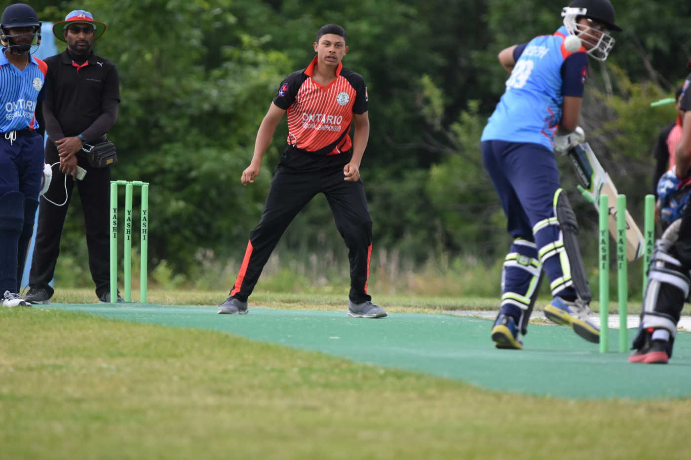 The top scorer in each of the two games was the only batter to score a boundary. Sahil Badin struck 3 fours and 1 six on the east ground, which is underneath some pathways of hydro wires in the former City of Etobicoke. The two stands in the West innings were 26 for the 3rd wicket from 10 overs (Saiwan Patel 7) and 21 for the 4th wicket in 4.2 overs (Brandon da Costa 6). Badin was out in the 28th over, which proved to be the last of that game. West U19s 76/6 from 27.4 overs. The highest stand in the South U16 innings was 45 for the 5th wicket, with Saad Khurram making 9 runs before falling lbw to Ethan Gibson.