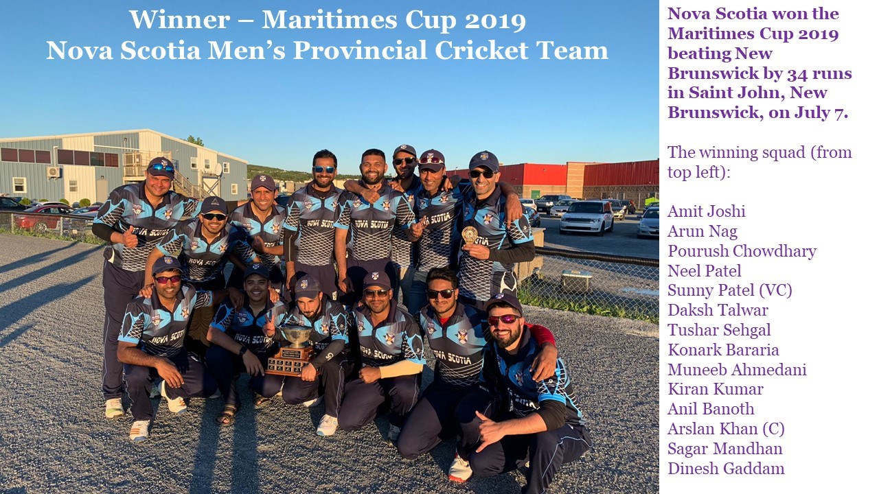 The Nova Scotia Men’s Provincial Cricket team won the Maritimes Cup 2019 defeating New Brunswick by 34 runs on July 7, 2019.