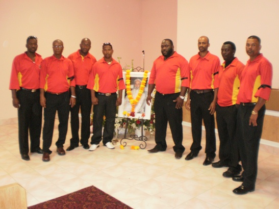 Members of the Parkdale Cricket Club pictured after today’s funeral (July 25) for Mr. Pandit Basdeo Maharaj at the Benisasia Funeral Home on Queent St West, Toronto. The players stand on either side of a garlanded photo of Pandit. He will be sadly missed and our condolences go to his family and many friends.