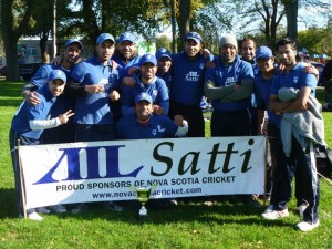 So, congratulations to Halifax Blue on this 2012 double success in the Halifax League’s T20 cricketing action. Thanks to Nova Scotia Cricket Association Vice-President Matt Lane for providing not only news of the game, but also a photo of the winning Halifax Blues team adorned with a banner that gives some payback to AIL Satti, the “proud sponsors of Nova Scotia Cricket”.