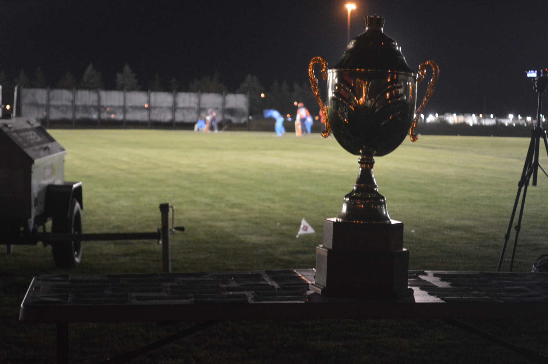 In the distance the illuminated batsmen, bowlers and fielders focus on the magical 22 yards of the cricket pitch. A light on the nearby highway provides the “midnight sun”, but that individual artificial sun is not sufficient to allow cricket to be played. In the foreground to the left of the photo is the base that houses the generator for one set of four lights mounted several metres above this base. The table with the tropy is in the middle of the photo, and on the left is a small patch of light. It is the display for a video camera, mounted on a the top of a tripod of the game in progress. One leg of the supporting tripod can be seen.