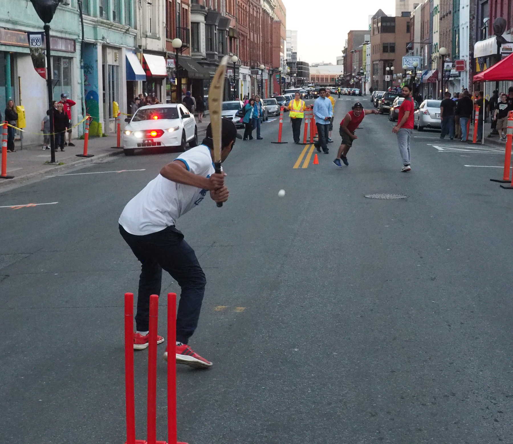 Members of Cricket Newfoundland and Labrador set perhaps a unique precedent, playing cricket on the main street of their capital city, St. John’s. The organization had been asked to provide a demonstration prior to an outdoor screening of the film “The Grand Seduction”, set in Newfoundland and with cricket playing a prominent role. The street was closed off, stumps set up, and a short game of tapeball cricket took place as dusk fell. Dave Liverman, secretary of Cricket NL, and cricket consultant on the Grand Seduction provided some explanation and commentary while provincial team members Rakesh Negi, Rahul Vashishta, Kranthi Kumar, Abrar Khan and Amit Sundly showed off their skills. The tapeball zipped off the fast pitch, but we saw some big hitting – direct hits were scored on a number of windows, a police car, and at least one shot landed on the roof of a 5 story building. There were an estimated 200 people present for the demonstration and movie, and Cricket NL encourage other provincial organizations to follow their lead. After all Montreal’s snow cricket festival has spread across the country, so we look forward to cricket at Portage and Main, on Yonge and Bloor, Robson Street and Boulevard St. Laurent.