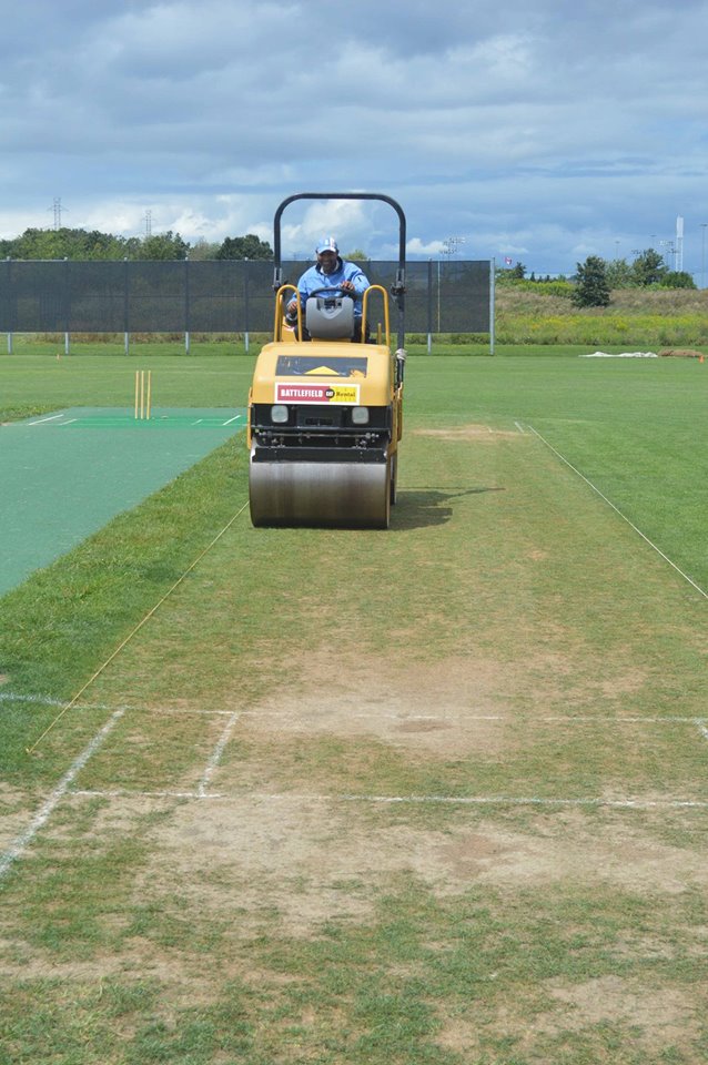 This infrastructure photo collection shows the volunteer groundstaff on a mower cutting the grass and, later, rolling one of the turf wickets.