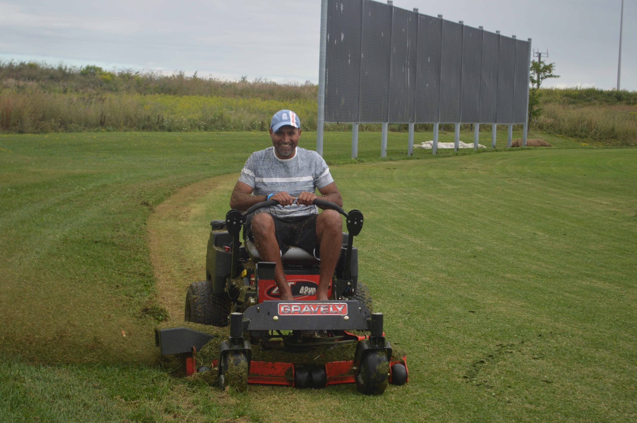Sunil D’Souza is driving the mower (and the roller)