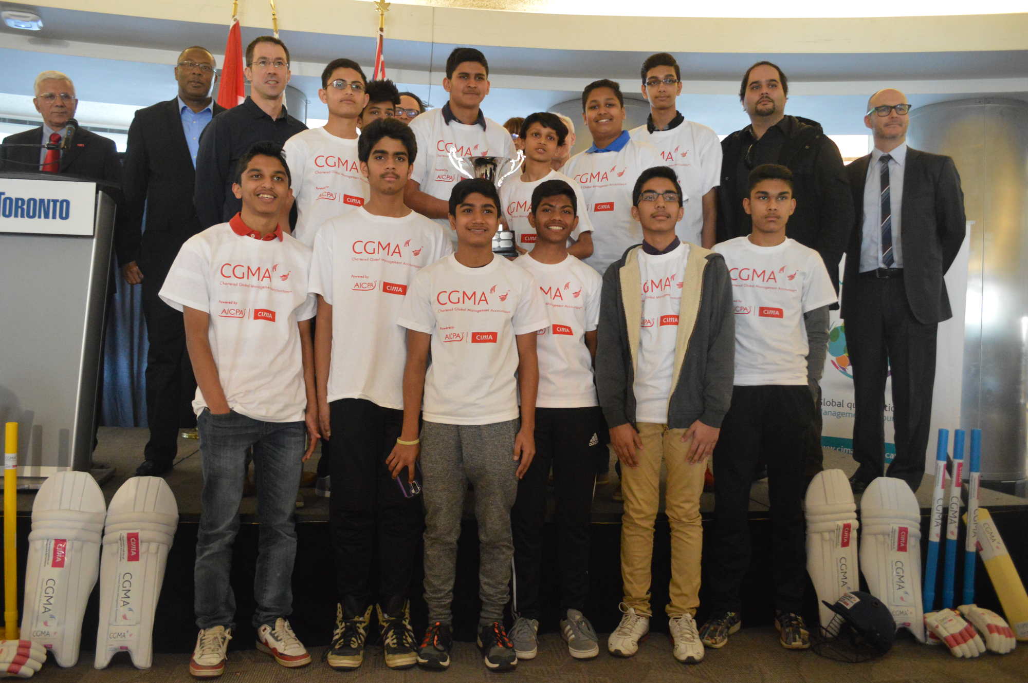 The 2016 Chartered Institute of Management Accountant’s (CIMA) Mayor’s School Cricket Tournament was officially launched on Thursday (April 14, 2016) at Metro Hall Toronto by Deputy Mayor Denzil Minnan-Wong and CIMA Vice-Chair Martin Buckle. The UK Consul General, representatives of the Toronto District School Board (TDSB), the Toronto Catholic School Board (TCSB) and the City’s Parks, Forestry and Recreation division were also involved in the launch. Sport Check was welcomed as the lead financial sponsor for this year’s tournament.